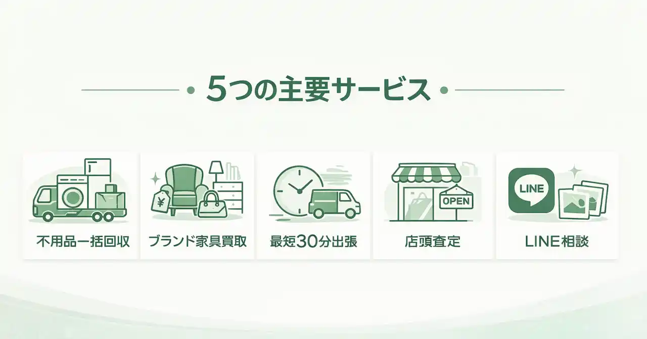| 出張買取はなまる千葉店が提供する“5つの主要サービス” | |||||||||||||||||||||||||||||||||||||||||||