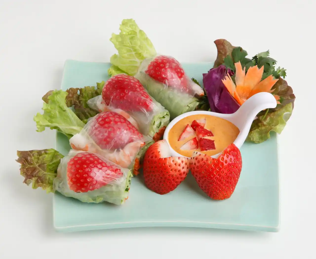 とちあいかとプリッとした海老を生春巻きで包みました。とちあいかの甘酸っぱさが引き立つ爽やかなメニューです。ハーブ香るトムヤムソースで、甘・酸・辛の三味同時体験を! |