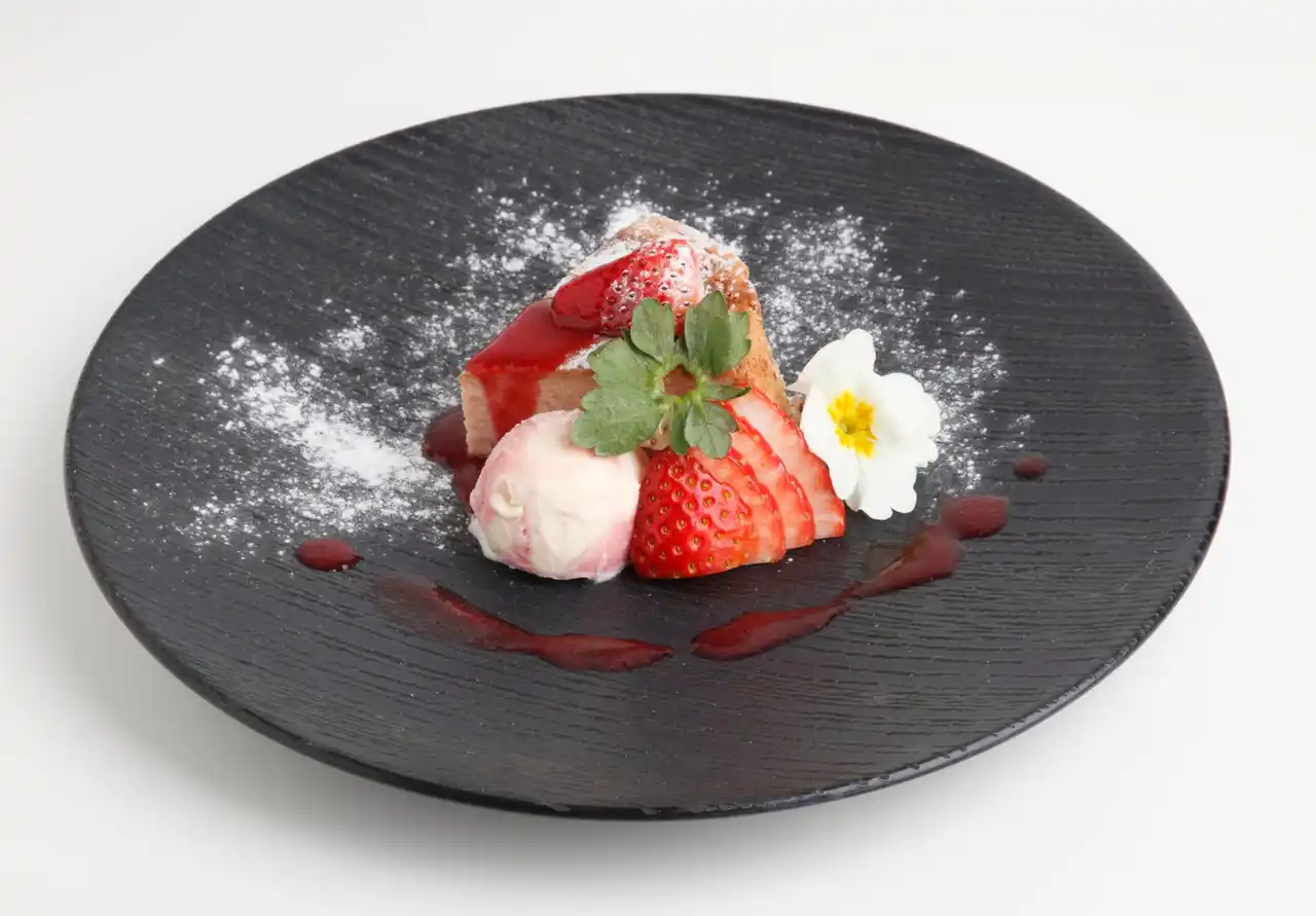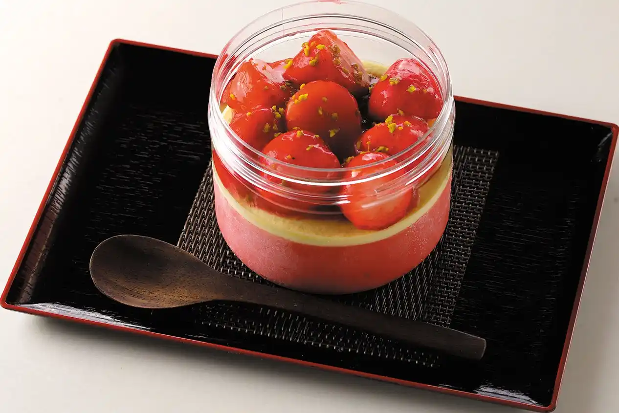 バニラ風味のババロアに、甘酸っぱいとちあいかのイチゴソースをかけ、果実をトッピング。 とちあいかの香りが引き立つ仕上がりです。 |