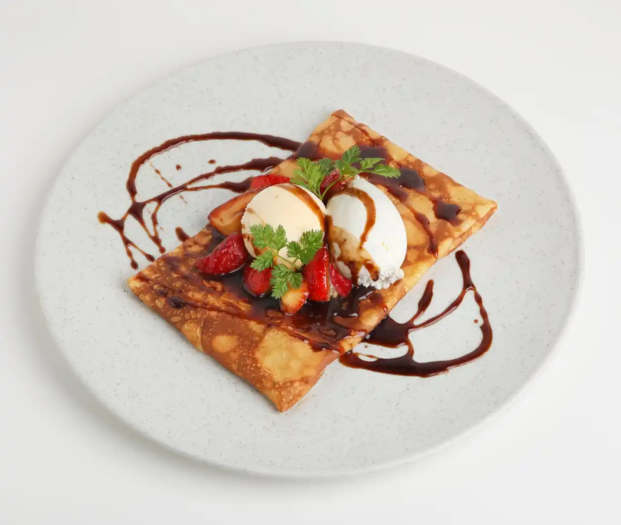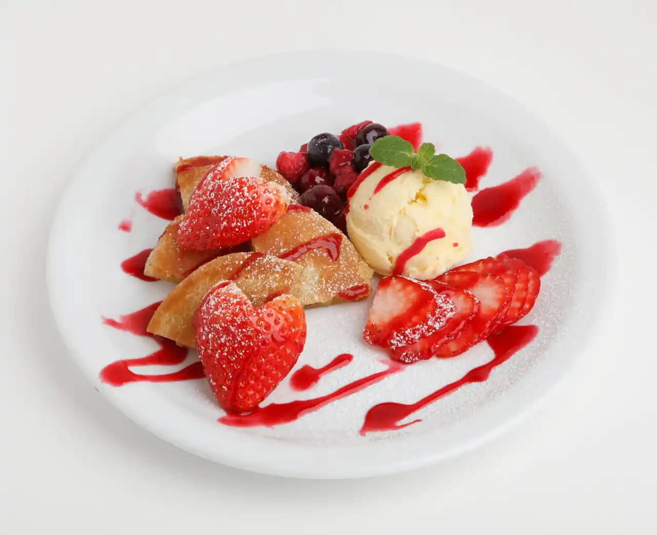 甘さと酸味のバランスが良いとちあいかをたっぷり使用。いちごは自家製キャラメルブールサレとバルサミコ酢でソテーし、甘さを際立たせました。バニラアイスとホイップクリームを加え、なめらかなカスタードクリームをクレープで包んでいます。 |