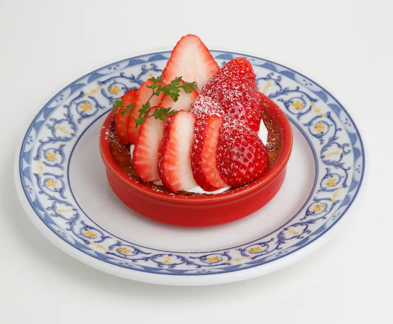 表面をパリパリにカラメリゼしたスペイン定番のデザート「クレマ・カタラーナ」に、とちあいかをふんだんにトッピングした毎年大人気のメニュー。いちごの甘酸っぱさが「クレマ・カタラーナ」の甘さを引き立たせた逸品です。 |