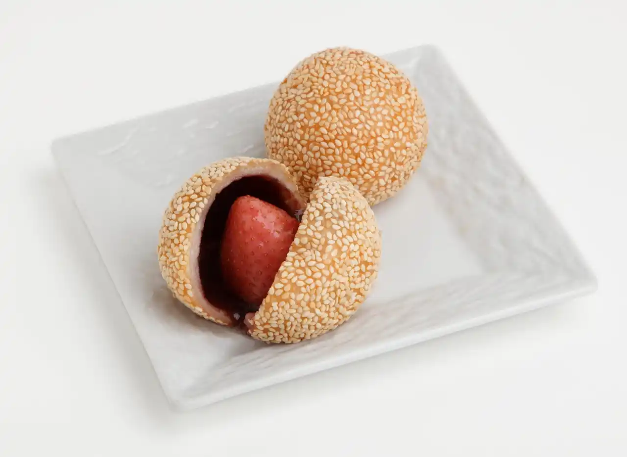 とちあいかをごま団子に入れて揚げました。とちあいかの甘酸っぱさと、なめらかなあんこが、上品な甘さのハーモニーを奏でます。 |