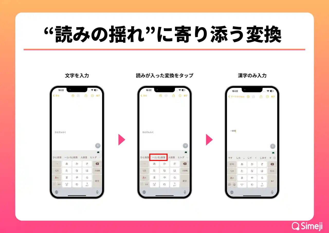 従来よりSimejiでは、読み間違えやすい言葉に対して、誤った読みでも正しい漢字を提示する変換機能を提供してきました。 |