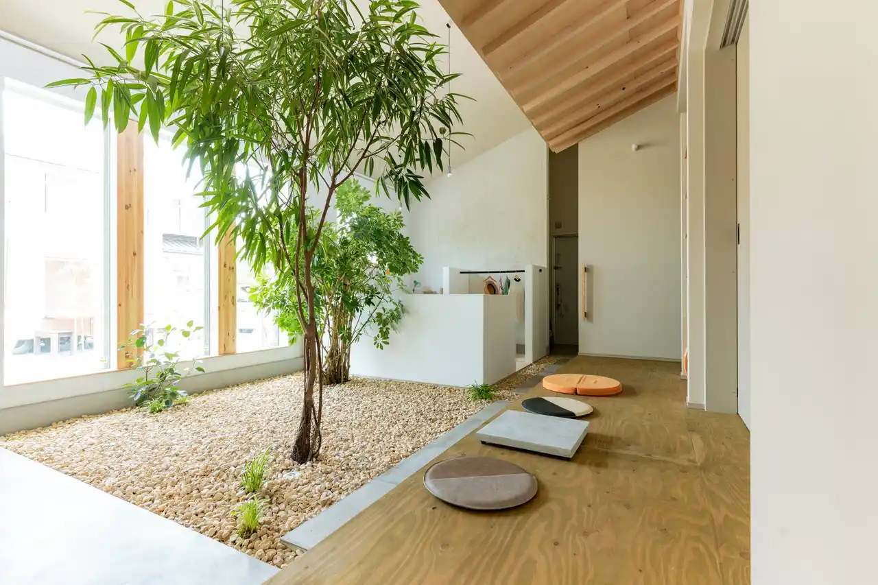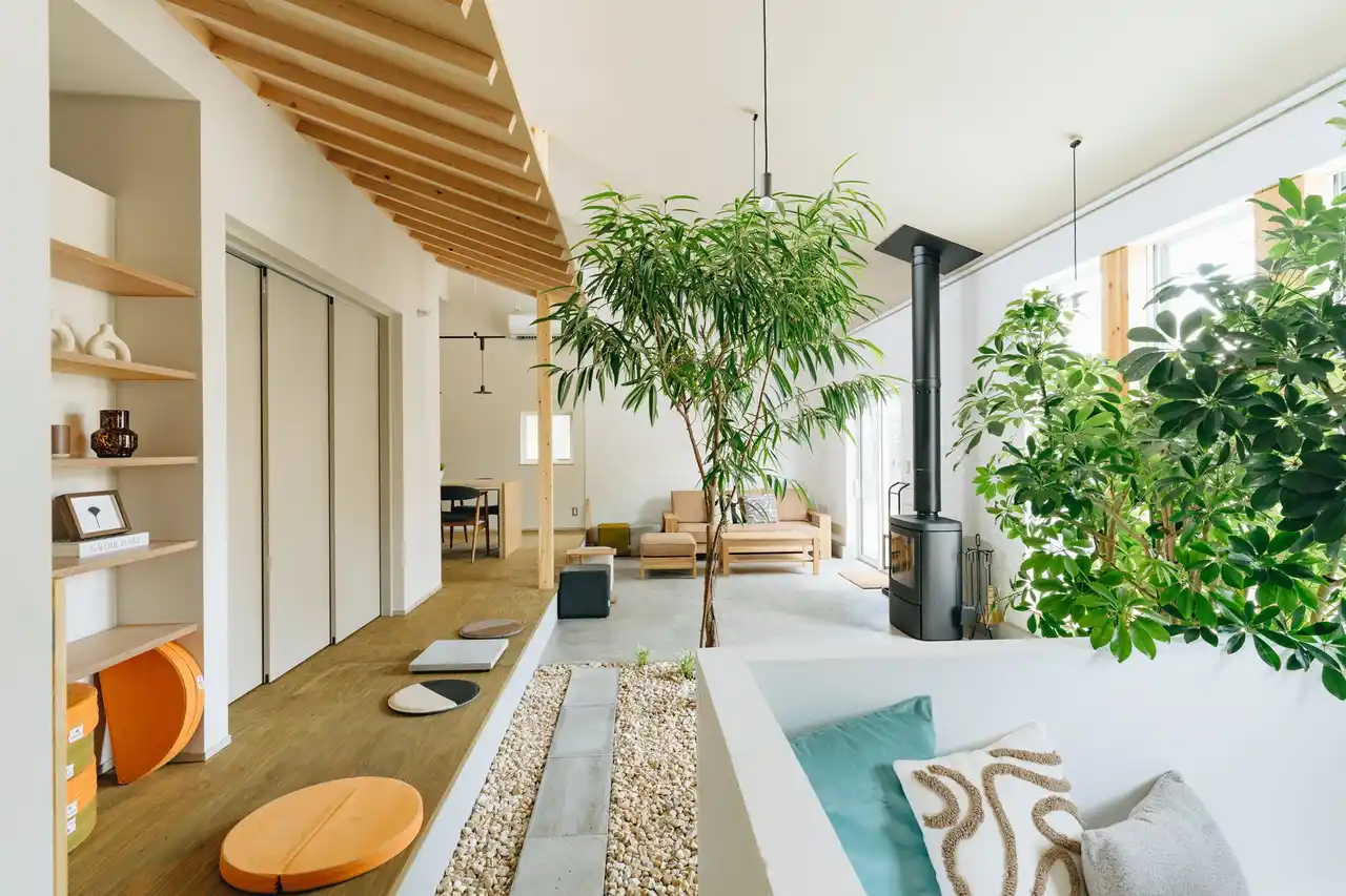 勾配天井で開放的な空間を感じられる設計により、限られた敷地条件でも豊かに暮らせる空間づくりを実現しました。 これまでの常識にとらわれない、“家の中で庭と暮らす”新スタイルは、土地購入からの注文住宅はもちろん、建て替えでも展開可能です。 |