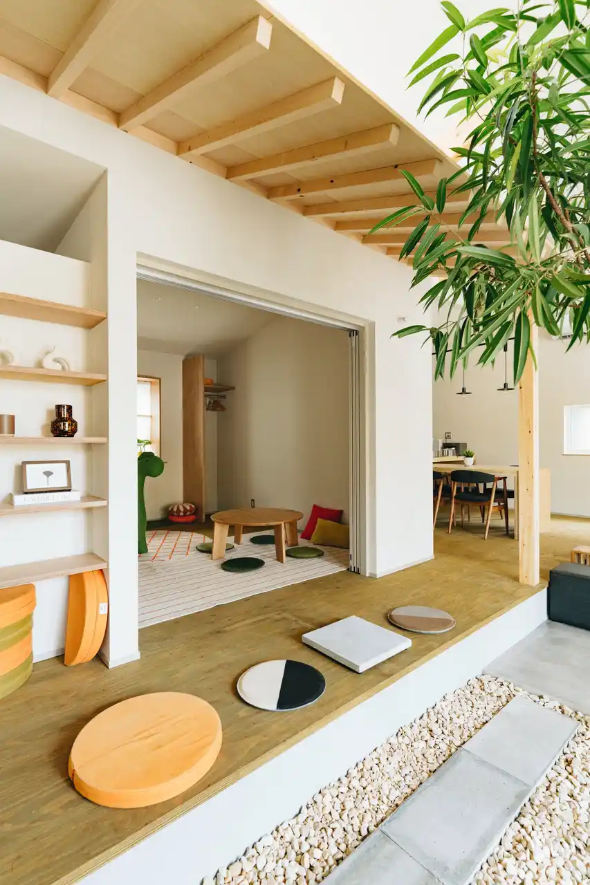 室内にいながらも緑を感じられる、新しい住空間の提案です。 庭を作ることが難しい面積の限られた建て替えや分譲住宅でも、“家の中に庭をつくる”という発想で、土間や縁側を取り込んだ非日常的な癒しの空間を実現しました。 |