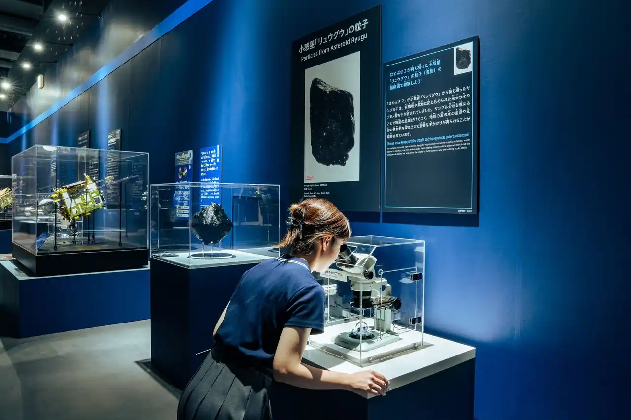 太陽系の起源を解明する重要な粒子(実物)を顕微鏡で観察できます。さまざまな困難を経て地球に持ち帰られた、日本の宇宙探査技術の結晶です。 |