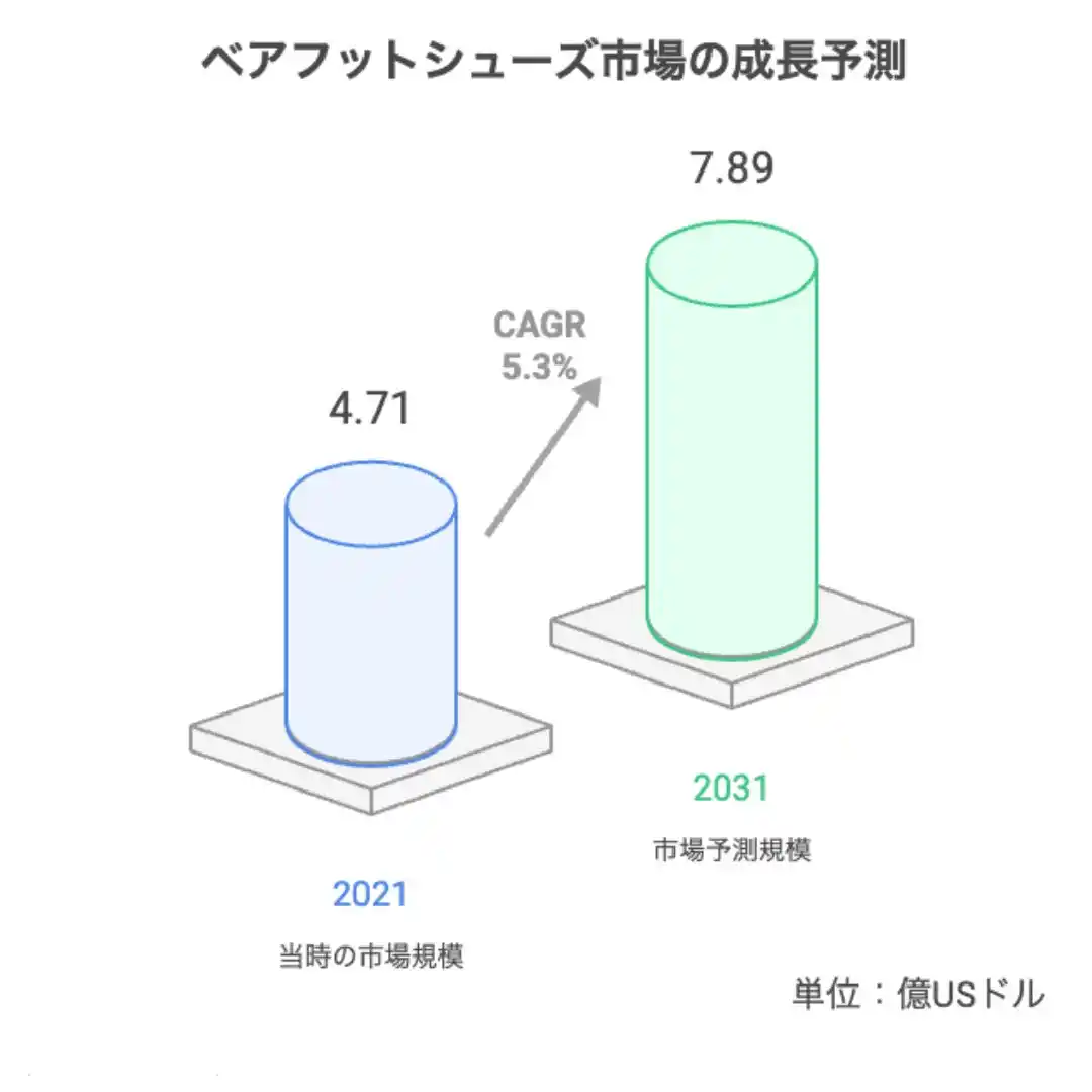 この価値観の変化はフットウェア市場にも大きな影響を与えており、足の健康を支える「ベアフットシューズ」の市場は、Allied Market Researchのレポートによれば、2021年の4億7,100万米ドルから、2031年には7億8,900万米ドル規模へ成長すると予測されています(年間平均成長率 5.3%)。※ |