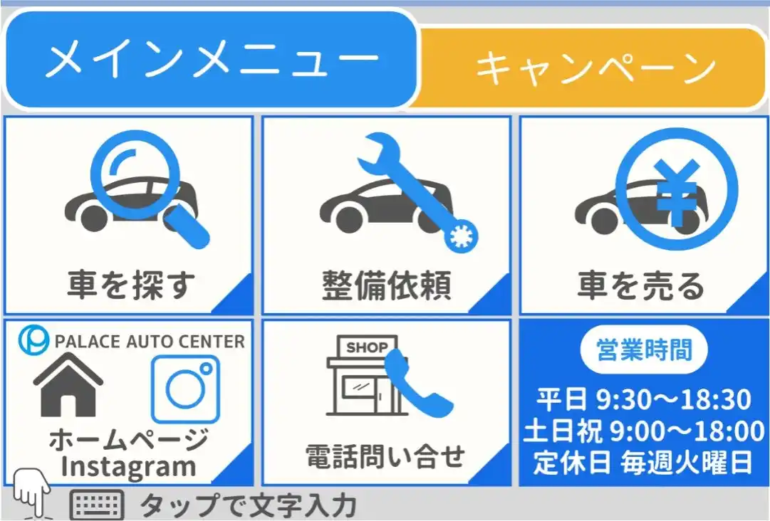 「車を購入したい」「整備を依頼したい」「車を売りたい」など、目的別にタブ付きリッチメニューを設計。 |
