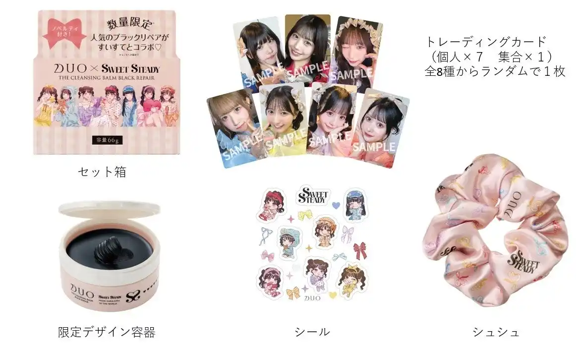 今回の限定商品では、「デュオ ザ クレンジングバーム ブラックリペア」と、若年層から絶大な支持を得ているKAWAII LAB.所属の7人組アイドルグループ「SWEET STEADY」がコラボレーション。さらに、ASOBISYSTEMに所属するイラストレーター「asuka」氏による書き下ろしイラストを配した外箱デザインになります。限定商品のみの付属品として、オリジナルデザインのシュシュ、シール、「SWEET STEADY」トレーディングカード(8種からランダムで1枚入ります。)の豪華セットとなっております。手にとるたびに心がときめくコスメとして、日常に寄り添う新しいブランド体験を提供します。 |