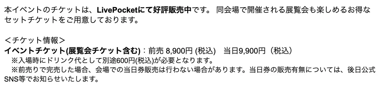 プレイガイド:LivePocket ※詳細はイベントページをご確認ください。 |