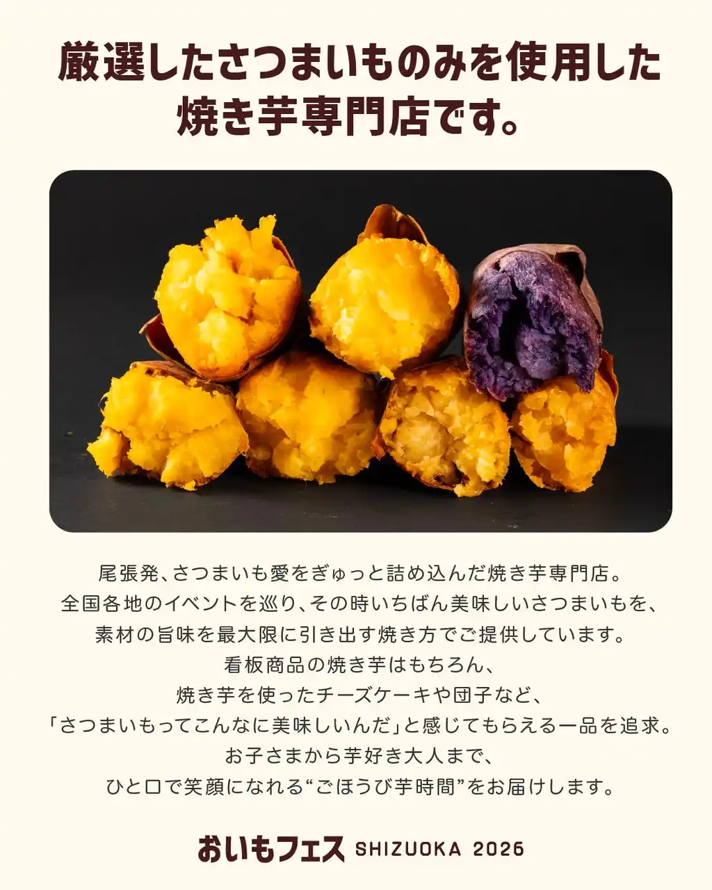 このたび、全国各地から焼き芋専門店やおいもスイーツ店、生産者が集結する静岡最大級のさつまいもイベントを、3日間にわたり開催いたします。 |