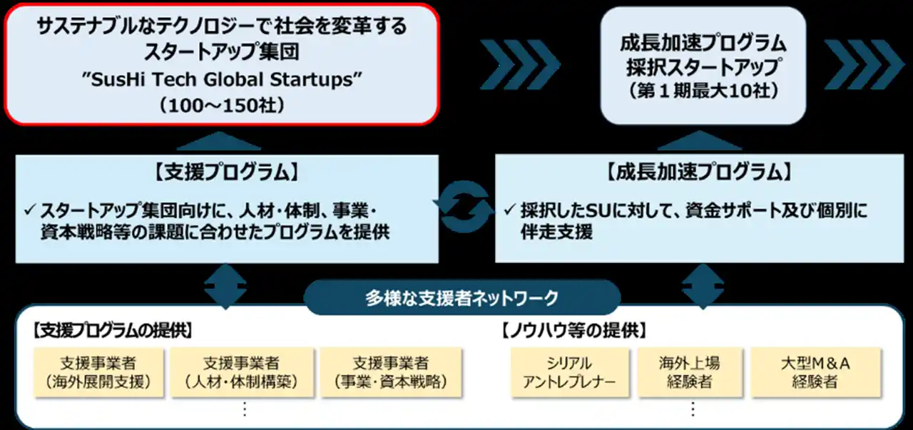 さらに、“SusHi Tech Global Startups”の中から、グローバルな成長につながる取組を募り、「成長加速プログラム」として1件当たり上限2億円の資金サポートとオーダーメイド型の伴走支援を実施します。 |