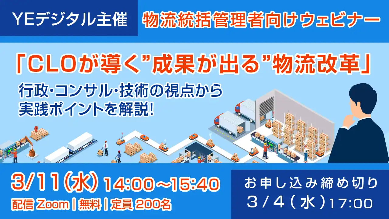 株式会社YE DIGITAL(本社:北九州市小倉北区、代表取締役社長:玉井裕治、以下、YEデジタル)は、物流DX推進のキーマンであるCLO(物流統括管理者)を対象に、行政・コンサル・技術の3視点から学ぶウェビナー「物流統括管理者(CLO)が導く”成果が出る”物流改革」を、2026年3月11日(水)に開催します。 |
