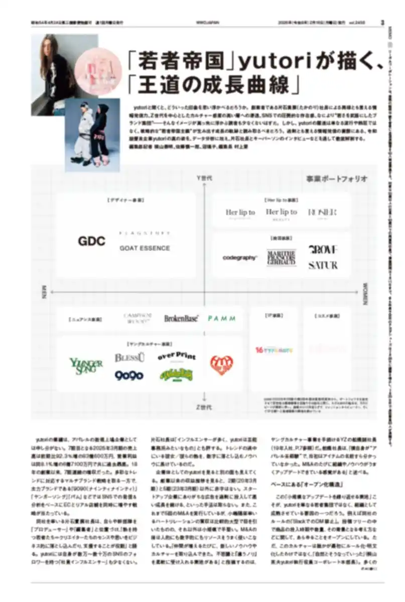 「WWDJAPAN」2月16日号は、「yutori特集」です。yutoriと聞くと、どういった印象を思い浮かべるでしょうか。創業者である片石貴展(たかのり)社長による異様とも言える情報発信力、Z世代を中心としたカルチャー感度の鋭い層への浸透、SNSでの圧倒的な存在感、そして“若さを武器にしたブランド集団“――そんなイメージが真っ先に浮かぶ人も少なくないはずです。しかし、yutoriの躍進は単なる流行や熱狂ではなく、戦略的な“若者帝国主義“が生み出す成長曲線として読み取るべきです。 |
