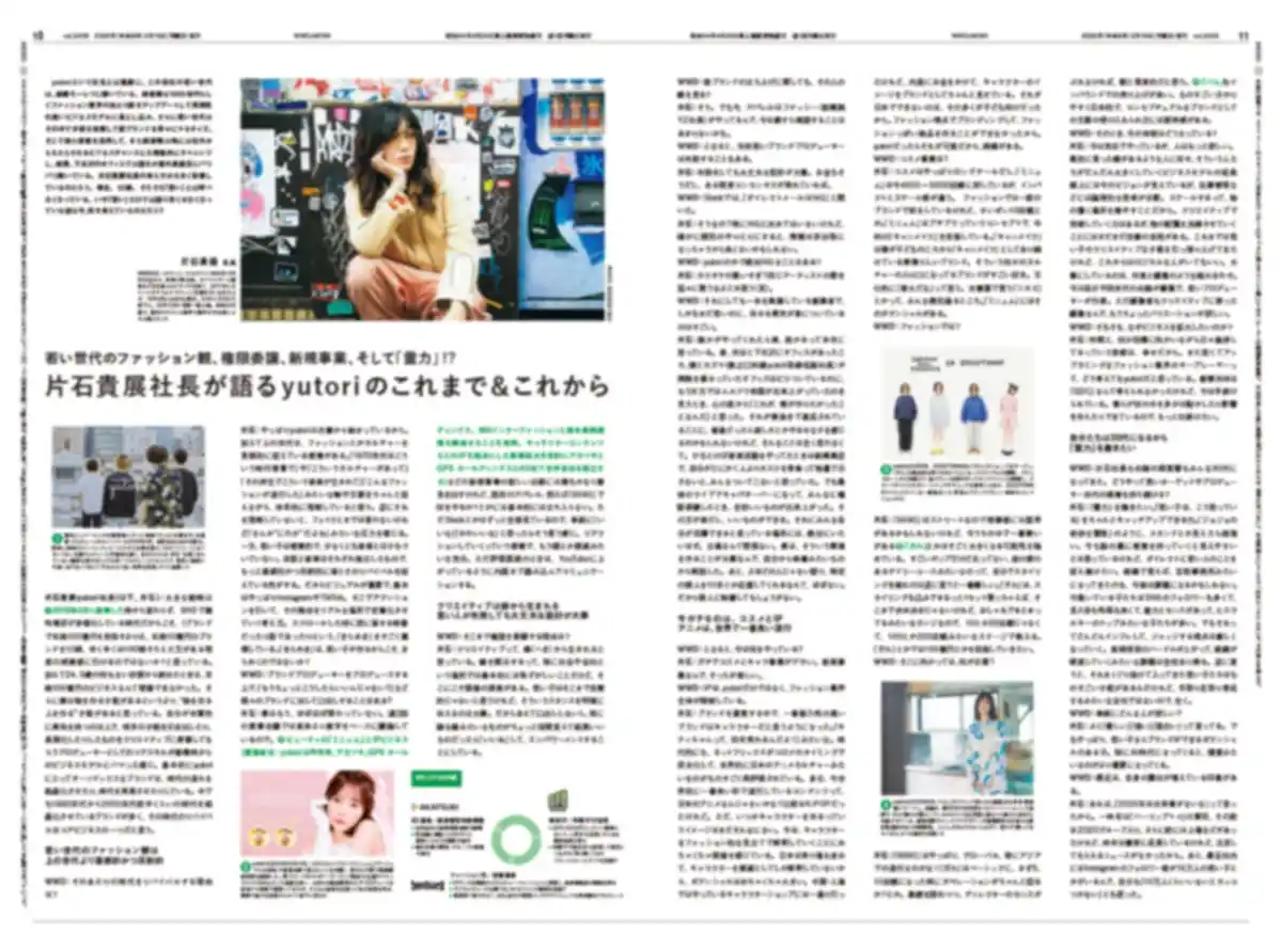 特集前半では、yutoriを取り巻く重要な数字(売上高や店舗数、チャネル別売り上げなど)、マルチブランド戦略を取るyutoriの全ブランドを網羅したインデックスなど、yutoriをデータとして読み解きます。 後半では、yutoriの躍進を支えるキーパーソンインタビューのほか、yutoriに深く関わるZOZOの広瀬COOOやアカツキ幹部、パルコ、伊藤忠など、「外から見たyutori」を読み解きます。yutoriを深く知り関わる内部&外部のキーパーソンを通して、yutoriの真の姿に迫ります。締めはカリスマ社長である片石貴展氏への独占インタビューです。これから目指す先から、片石社長個人がいま磨いていることまで、あらゆることを聞きました。 |