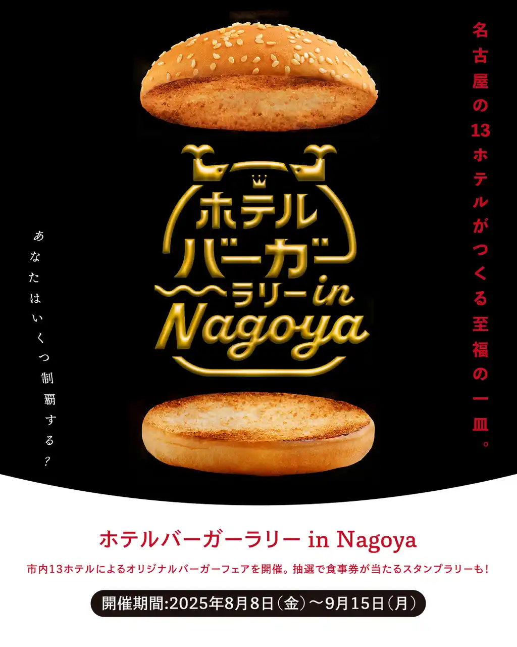 「ホテルバーガーラリー in Nagoya」と題した本共同イベントでは、名古屋の夏を盛り上げるべく市内の13ホテルがそれぞれ趣向を凝らしたこだわりのバーガーを提供いたします。本企画は、気軽にホテルレストランをご利用いただき、お好みのバーガーを楽しみながらホテルの魅力を感じていただける、新たな取り組みです。 |