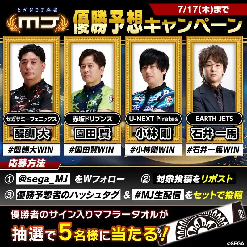 7月17日(木)19:00より配信予定の“【セガNET麻雀 MJ】12周年記念大会”の優勝者を予想するキャンペーンを『MJ』公式X(@sega_MJ)にて実施します。 |