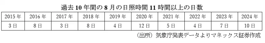 大阪において2015年から2024年までの10年間、日照時間が11時間以上だった8月の平均日数は6.4日でした。 |