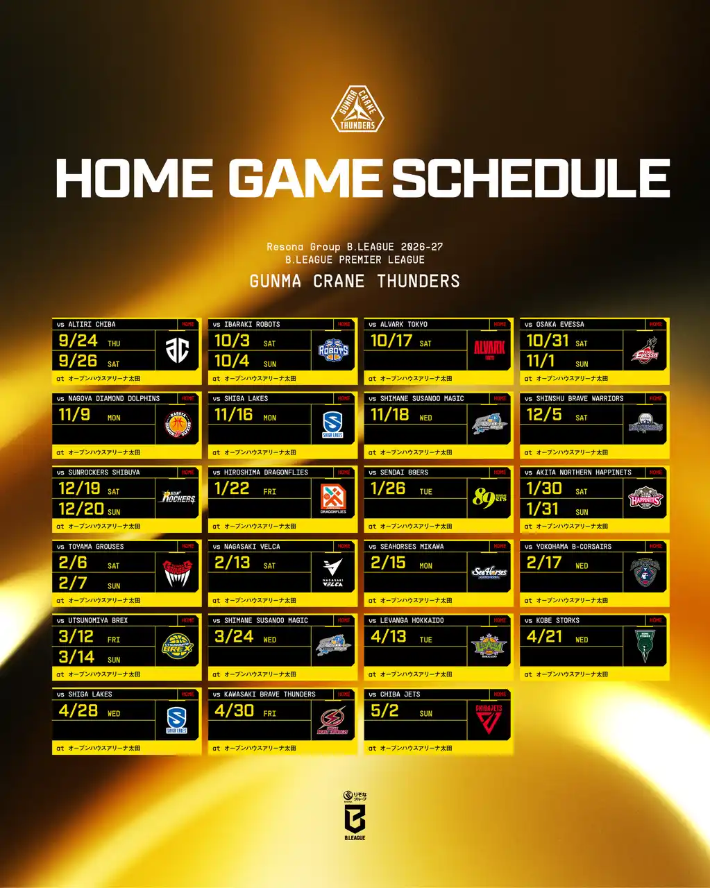 いつも群馬クレインサンダーズに温かい声援をいただき誠にありがとうございます。 りそなグループ B.LEAGUE 2026-27 B.LEAGUE PREMIER、群馬クレインサンダーズの対戦相手、試合日、試合会場が決まりましたので、お知らせします。 なお、2026年9月22日~2027年1月3日の期間の試合開始時間については、2026年7月頃にBリーグより発表予定です。 ※試合時間の発表スケジュールは変更になる可能性がございますので、予めご了承ください。 |