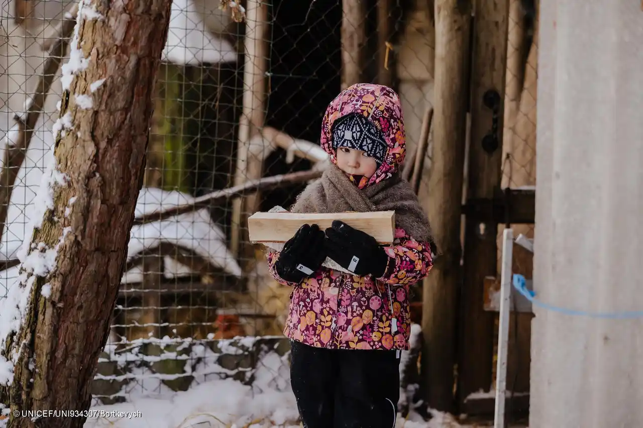 キーウへの攻撃で電気、暖房、水が使えなくなり、家族でキーウ州ミコライウカまで避難してきた4歳のアリカちゃん。氷点下18度の寒さの中、唯一の暖房器具である薪ストーブを使っている(ウクライナ、2026年1月18日撮影) (C) UNICEF/UNI934307/Bortkevych |