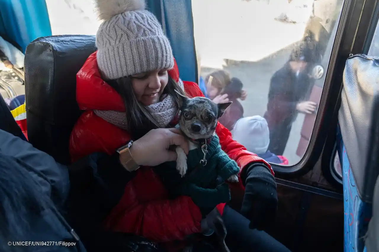 ドネツク州クラマトルスクから避難バスに乗る11歳のキラさん。近所の建物が砲撃被害を受けたため、安全を求めて家族とともに自宅を離れることになった(ウクライナ、2025年12月25日撮影) (C) UNICEF/UNI942771/Filippov |