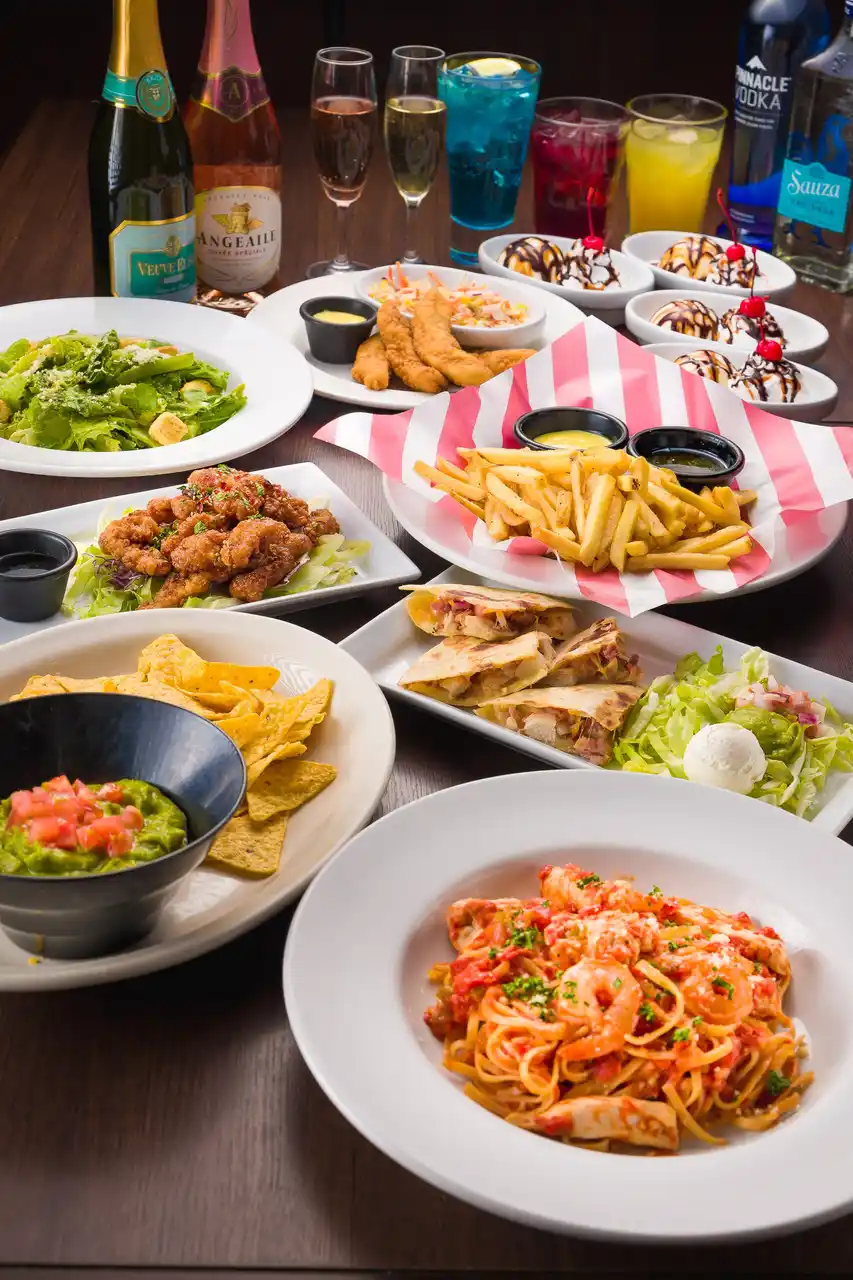 シーザーサラダ・フライデーズシグネチャー チキンストリップ・チキン フィンガー・ チキン&シュリンプ ディアブロ・チキン ケサディア・コールスロー・ガカモレ&チップス・フライデーズフライ & 2種ディップ (フライデーズフライはおかわり自由! ハニーマスタードとハニーバターの2種のディップ付き)・ミニサンデー |