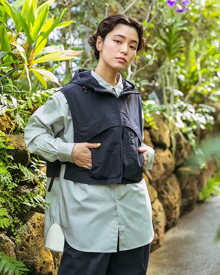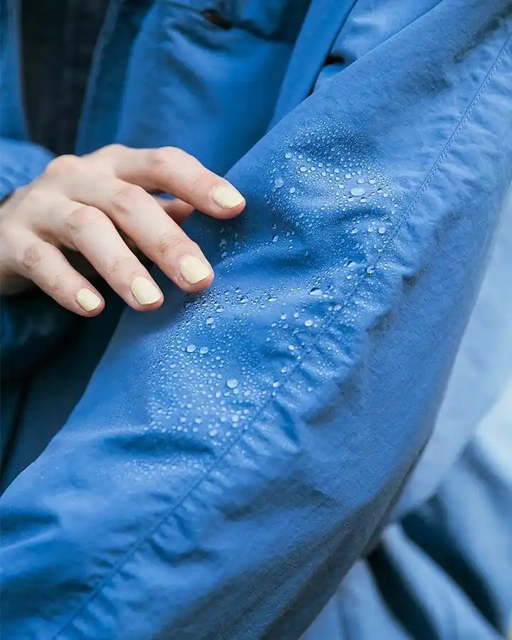 軽量性、撥水性、UVカットの特性を併せ持つ機能素材。 ナイロン素材でありながら独特のぬめりを感じにくく、肌離れの良さが魅力。 シワになりにくいイージーケア性もあり、アクティブシーンや旅先でも重宝します。 |