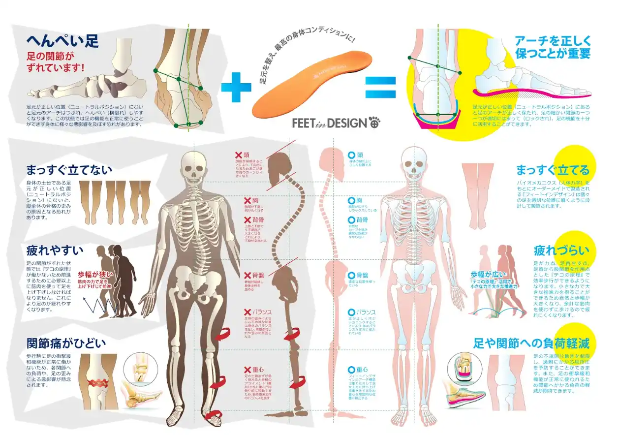 足元のバランスは、姿勢・歩行・関節の負担に直結します。 今回導入するフィートインデザインのオーソティクスは、医療的知見に基づく評価と設計により、足部を適切なポジションへ導き、身体全体のバランス改善をサポートします。 |