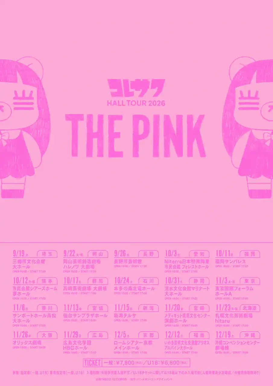 また、先日全会場SOLDOUTにて終了した「コレサワ Zepp LIVE 2026 ラブリーパンクツアー」のZeppDiverCity公演では、次回のホールツアーのタイトルとビジュアルが発表された。「コレサワ HALL TOUR 2026 THE PINK」と題し、コレサワ初のホールツアーで全国20ヶ所での公演を予定しているのでぜひライブにも足をはこんで欲しい。 |