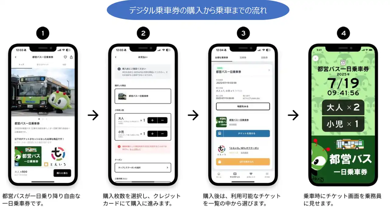 本サービスでは都営バス一日乗車券(大人500円、小児250円)をスマートフォンのアプリを通じて、乗車前に、キャッシュレスでご購入いただけるほか、デジタル乗車券をご購入された方に、都営交通沿線セレクトショップ「とえいろ」で利用できる10%オフクーポンをプレゼントします。 |