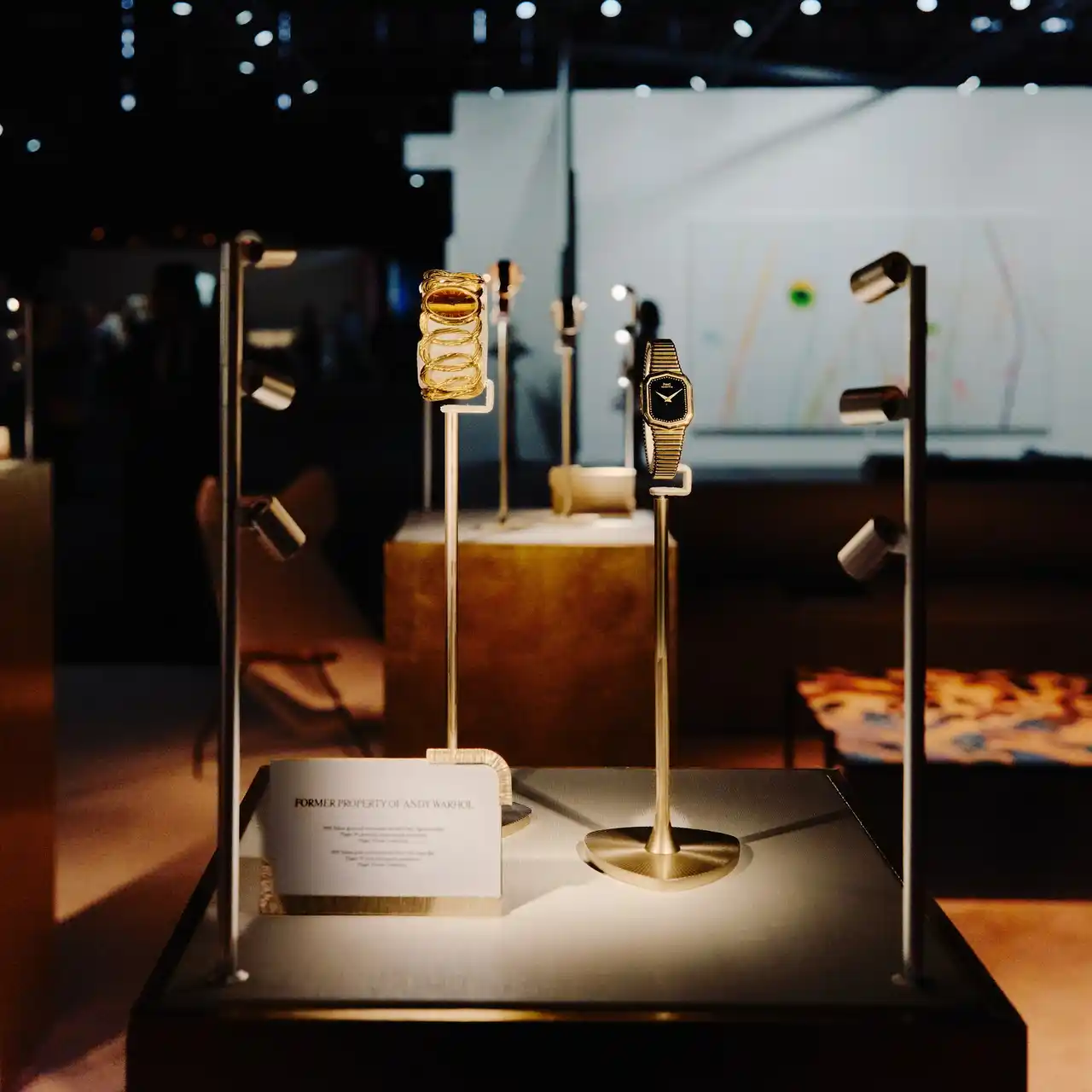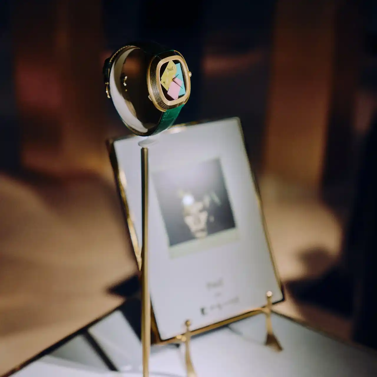 ウォッチが披露されました。このクリエイションは、ピアジェの創業150周年を記念した新たなコラボレーションから生まれたものです。ウォーホルの最も有名なポラロイドコラージュの自画像のひとつから直接インスピレーションを得ており、彼が1973年に所有していたウォッチに敬意を表しています。隣には、かつてウォーホルが所有していた歴史あるピースがふたつ並び、彼の華やかな趣味と大胆さを彷彿とさせます。非常に奇抜な『Montre-Lingot』(Ref.9088)。そしてブラック