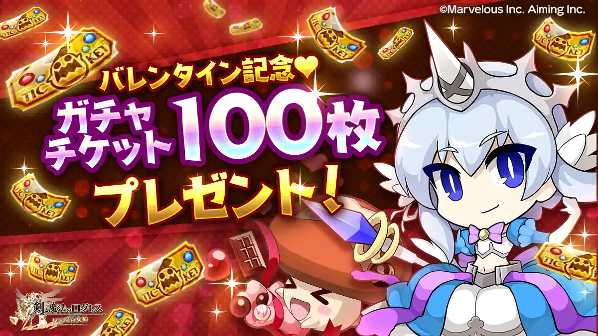 バレンタインの特別なプレゼントとして、バレンタインガチャチケット100枚を期間中の初回ログイン時にお贈りします。 |