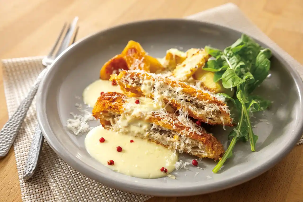 ミルフィーユカツレツ ゴルゴンゾーラソース(税込1,969円) ハモンセラーノとチーズを重ねたカツレツに、ゴルゴンゾーラの香り豊かなクリーミーソースを添えた贅沢な一皿。ピンクペッパーの爽やかな風味がアクセントとなり、全体の味わいを引き締めます。 |