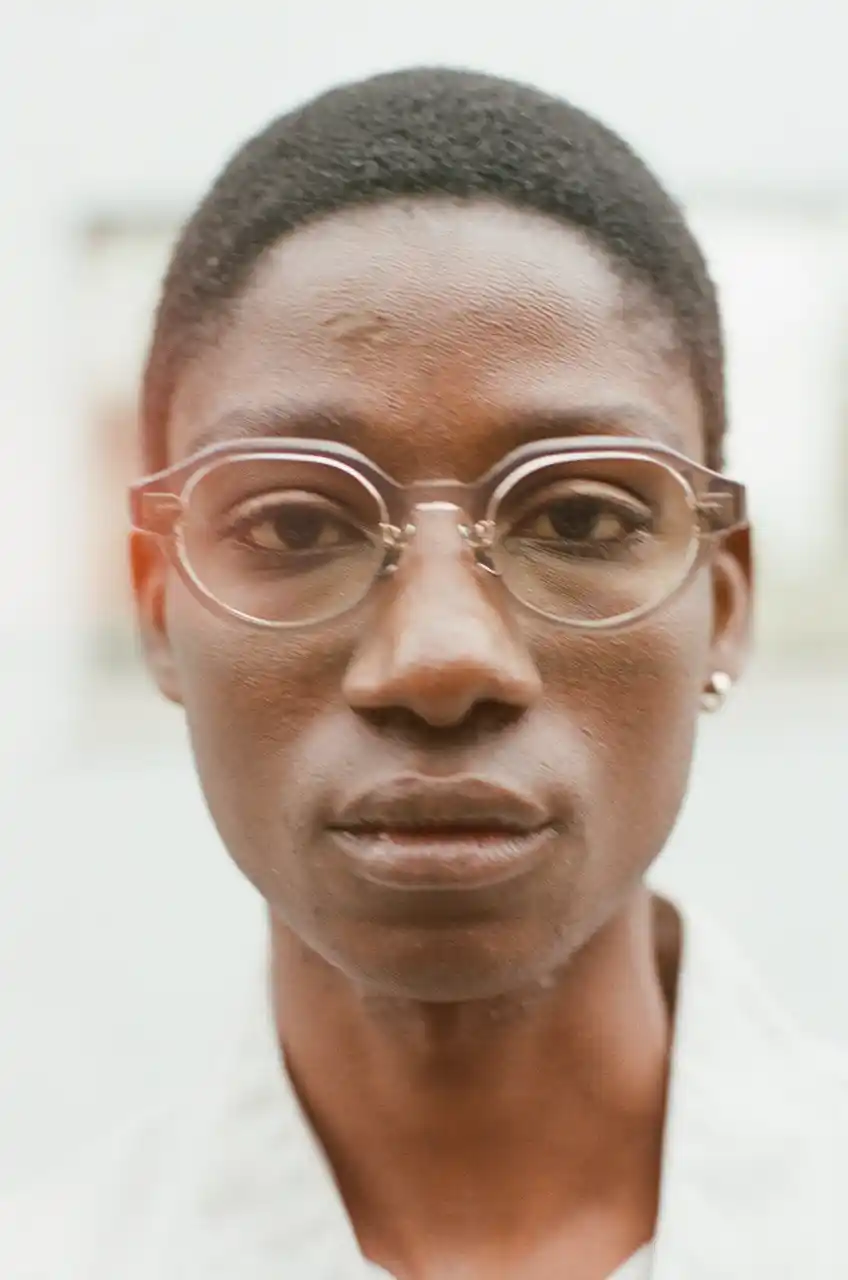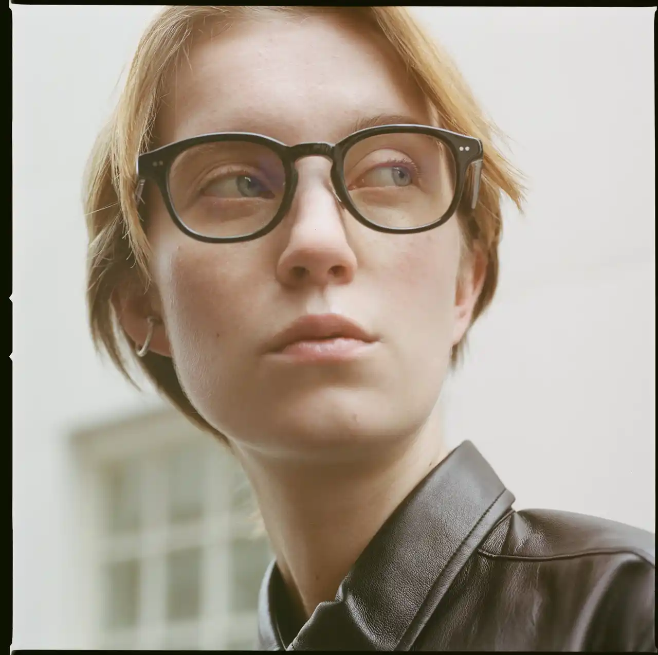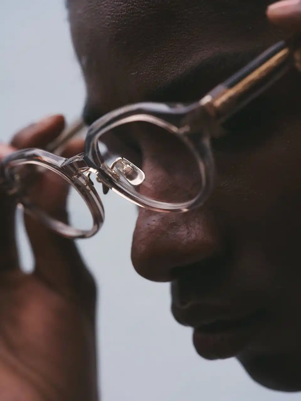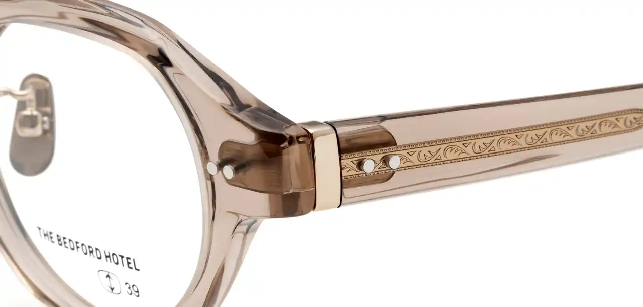 クリアなテンプルから細やかな彫金を施した金属芯が覗き、角度や光の当たり方によって表現が変化する、さりげない存在感をまとったデザインです。テンプルエンドには空洞を設けた意匠を施し、金属の質感が際立つヴィンテージな雰囲気を演出しています。 |