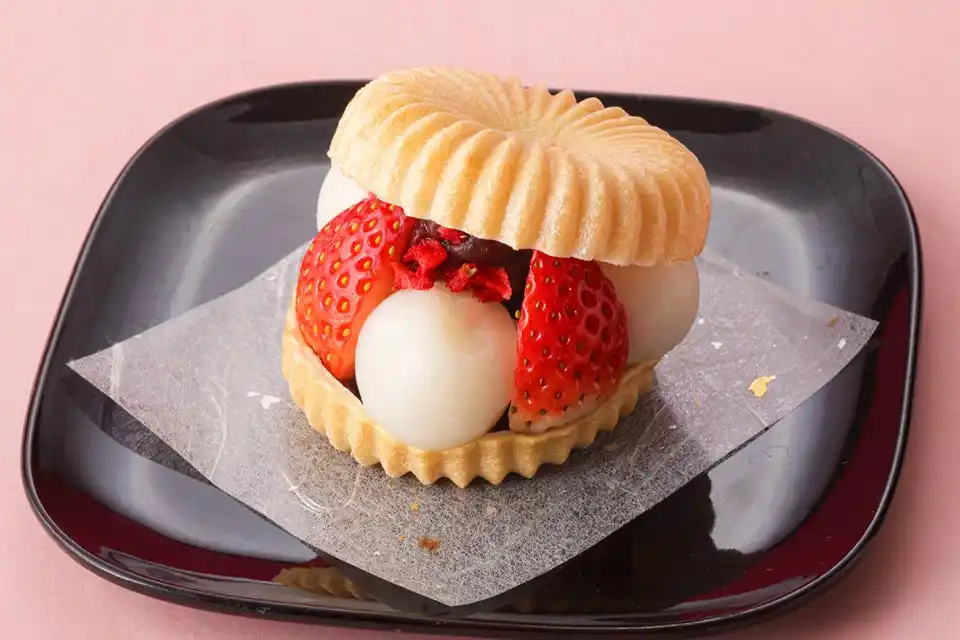 一口噛めば「パリッ」と小気味よい音が響く、香ばしい皮が自慢の最中。中にはみずみずしいあまおうともちもちの白玉、そして上品な甘さの餡を合わせました。ドライいちごの濃縮された香りが、全体の風味を引き立てます。 |