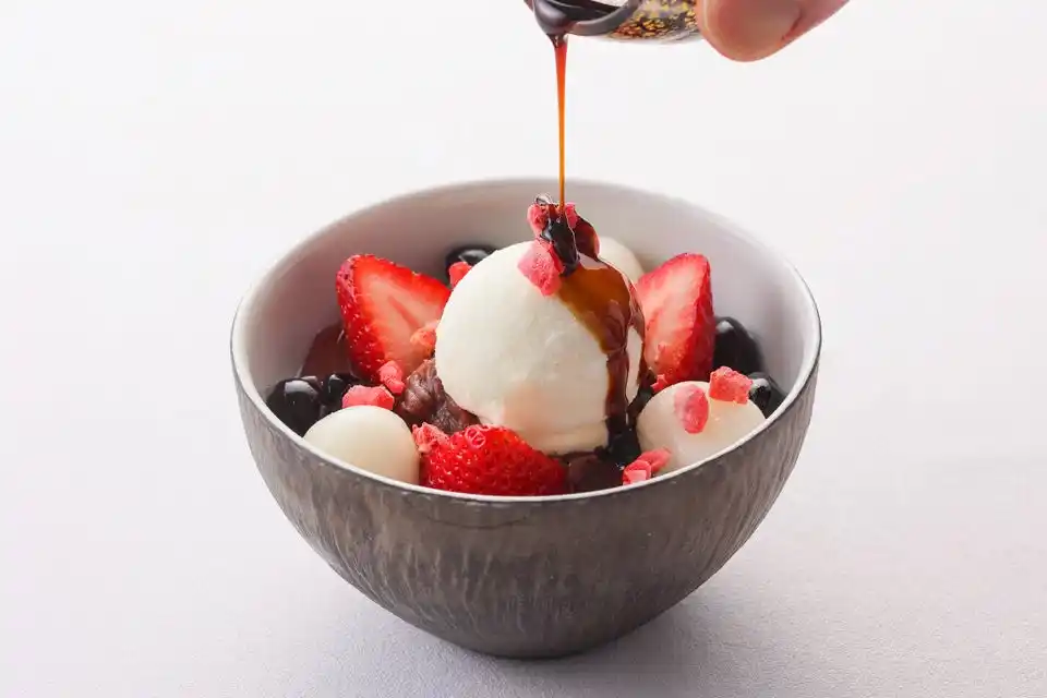 みずみずしいあまおうと、じっくり炊き上げた最高級の丹波産黒豆が織りなす至福のあんみつ。なめらかなミルクジェラートに、凝縮された甘みのドライいちごを散らし、彩り豊かに仕上げました。 |