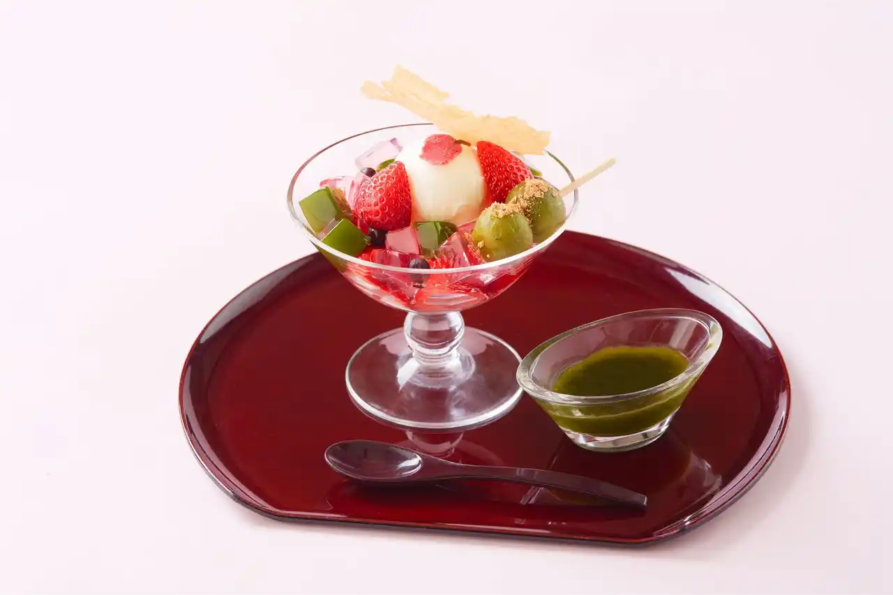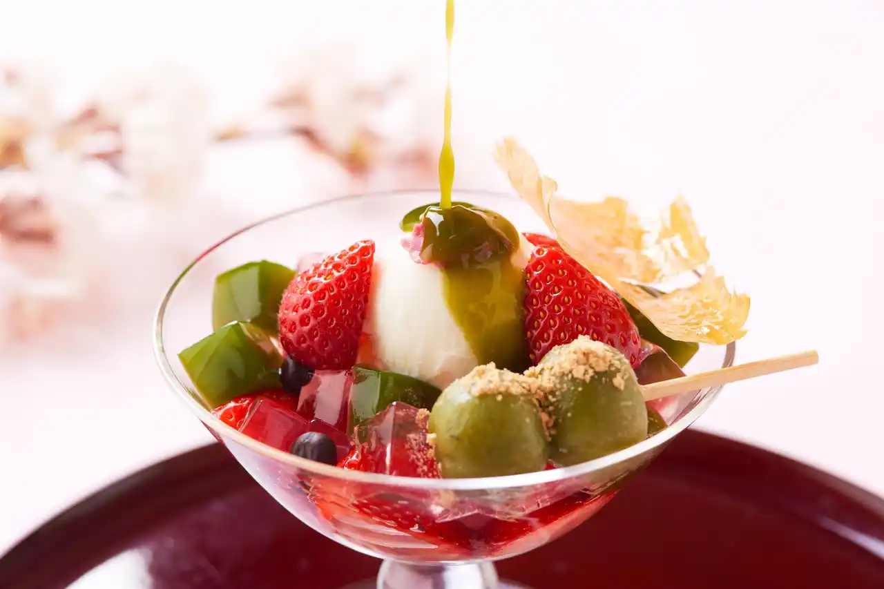 旬を迎え、最も甘みが強く香り高い「あまおう」を主役にした春限定和風パフェ。鮮やかな桜色の寒天と、ほろ苦く濃厚な抹茶寒天が美しいコントラストを描き、その上にはふっくらと炊き上げた赤えんどう豆と、口どけなめらかなミルクジェラートをトッピング。トップには可愛らしい「串だんご」を添え、見た目にも心躍る春の装いに。 |