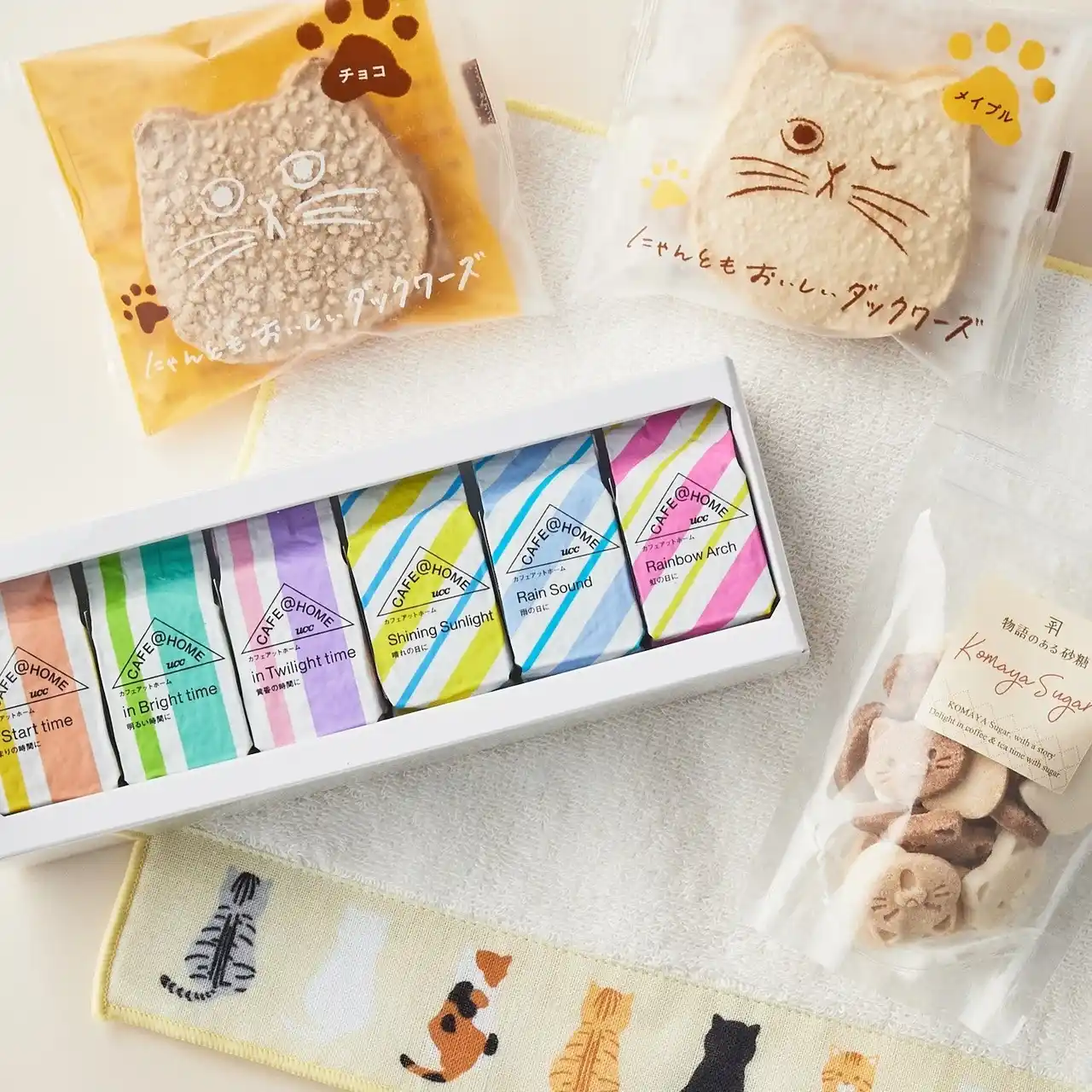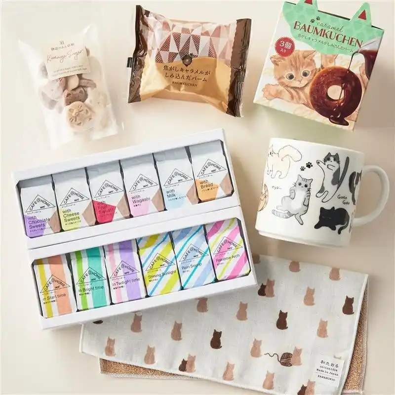 CAFE@HOMEの人気商品12種とスイーツ、猫のマグやタオルなどが詰め合わせになっている豪華なセット。 |