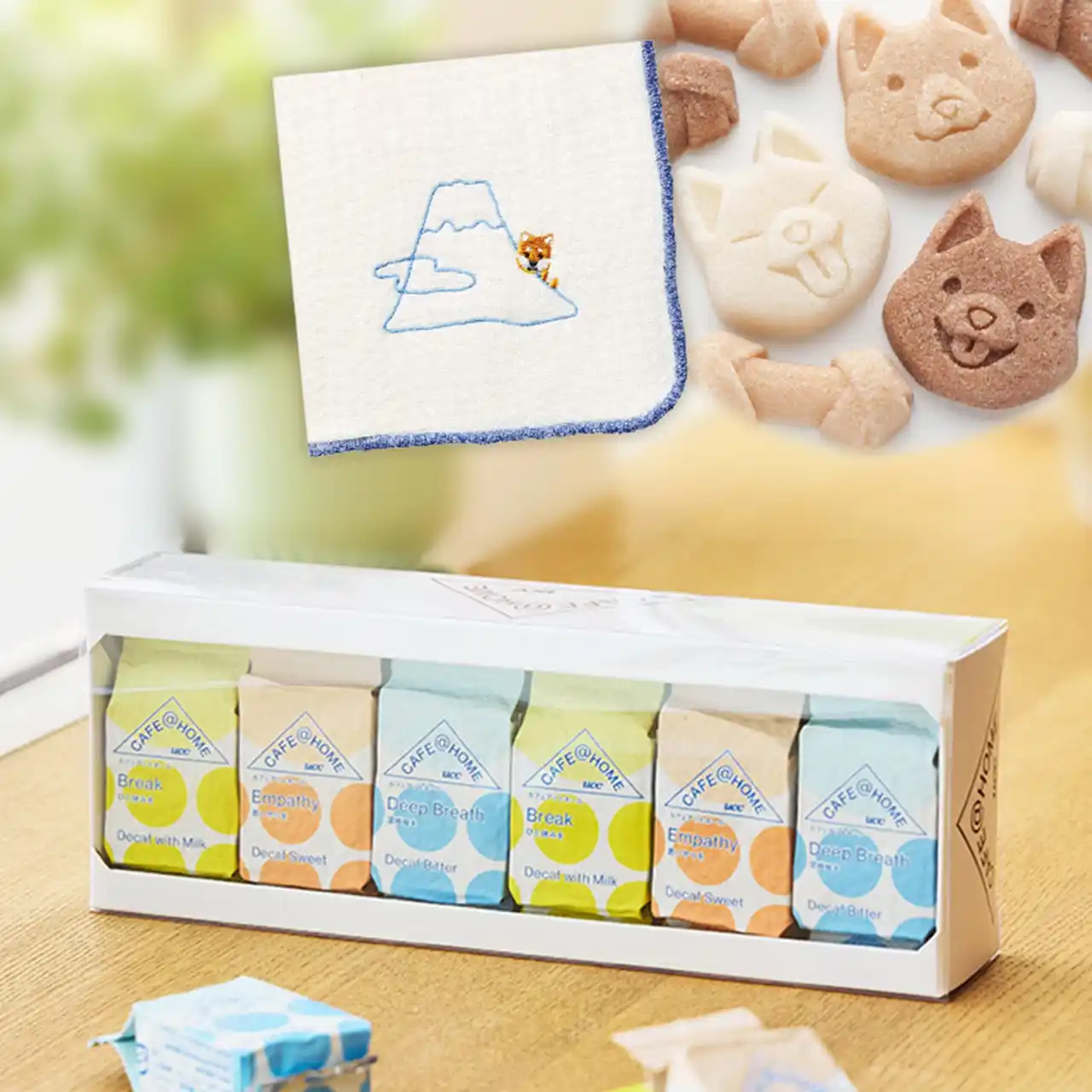 どんな時でもあなたに寄り添う、デカフェコーヒー3種×2個ずつと、可愛い犬型のお砂糖・富士山からひょっこり顔をのぞかせる豆柴柄のタオルが一緒になったセット。戌の日にちなんだ「安産祈願」の贈り物にも! |