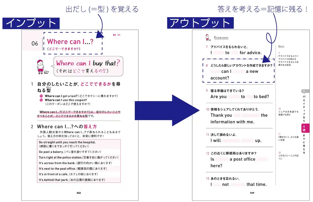 本書は、それぞれの型(パターン)をインプットした後、その型(パターン)を定着させるための問題でアウトプットまでできる構成です。穴埋め形式で正解を考えることで、記憶に残りやすく、効率的に身につけられるトレーニング方法となっています。 |