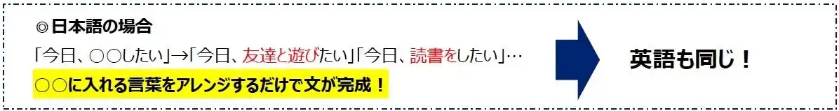 日本人も英語圏の子どもも、母国語を身につける過程では、まず型(パターン)を習得し、その型(パターン)を適宜アレンジしながら表現を増やしていきます。特に英語は文の出だしがパターン化されているため、一度型(パターン)を覚えてしまえばアレンジ次第でさまざまな表現が可能になります。一方で、最初の出だしでつまずいてしまうと、その先に進むのが難しくなるのも事実。だからこそ、英語学習においては「型(パターン)を覚えること」が最も重要なカギだと言えます。