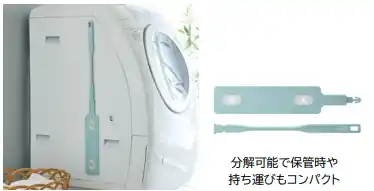 持ち手部分にマグネットを搭載し、冷蔵庫や洗濯機にピタッと貼り付けて収納することができます。さらに、中央で分解できる構造のため、保管時や持ち運びの際もコンパクトに収まり、場所をとりません。 |