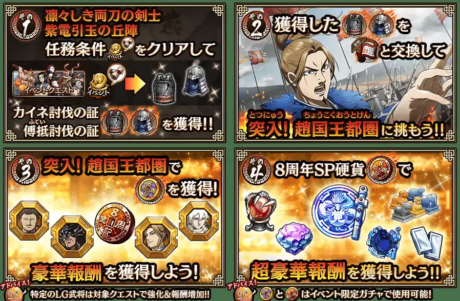 イベントクエスト『突入! 趙国王都圏』では、8周年記念硬貨ガチャで使用する『8周年記念硬貨』が獲得できます! |