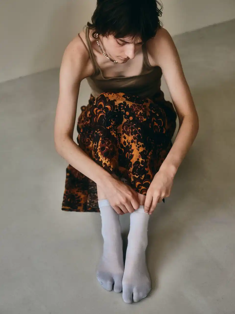中でも Trimy は、境界をほどく一足。ストッキングの軽やかさが描く繊細なラインと、靴下がもたらす安定感と強さ。相反する要素を静かに溶け合わせ、足元に新しい感覚を生み出しました。消臭機能と着圧機能をも備え、長い一日さえも快適な時間に。光を受け止め、影を映し、歩くたびに表情が変わる様を楽しめます。 |
