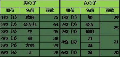 男の子部門では「琥珀」(75頭)が1位となり、昨年に続きトップを維持しました。2位は「茶々丸」(64頭)、3位は「空」(45頭)でした。 女の子部門では「姫」(29頭)が1位。「琥珀」(25頭)は女の子部門でも3位に入り、男女双方で上位にランクインしました。漢字表記では、男女ともに自然や縁起を連想させる名前が多く見られました。 |