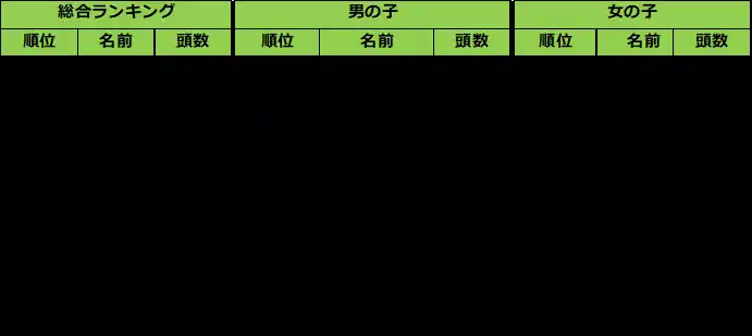 総合ランキングは「ムギ」(438頭)が1位となり、7年連続でトップを維持しました。 2位は「ラテ」(349頭)、3位は「ルナ」(338頭)と続き、上位3位はいずれも300頭を超える結果となりました。また「ルル」は前年10位から4位(285頭)へと大きく順位を上げ、「ラテ」も5位から2位へ上昇するなど、上位で順位の変動が見られました。 |