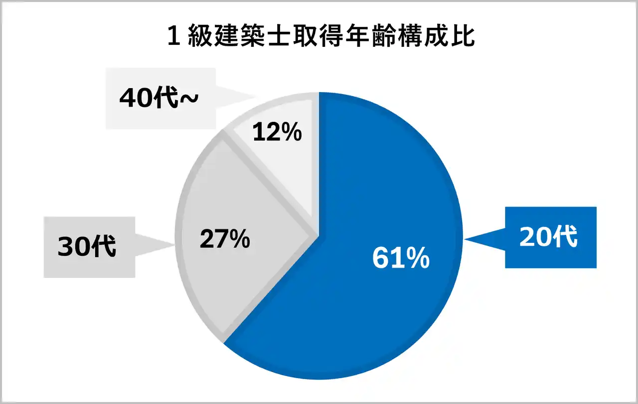 | 近年、社会全体として一級建築士試験の合格者の年齢層が若年化しており、合格者の6割以上が20代という状況があります(図1)。若手のうちに資格を取得することが、将来のキャリア形成において大きなアドバンテージとなることが明らかになっています。加えて、近年の試験では製図課題の情報量や自由度が増すなど、難易度が上昇傾向にあり、計画的かつ体系的な学習支援の必要性が高まっています。 | ||||||||||||