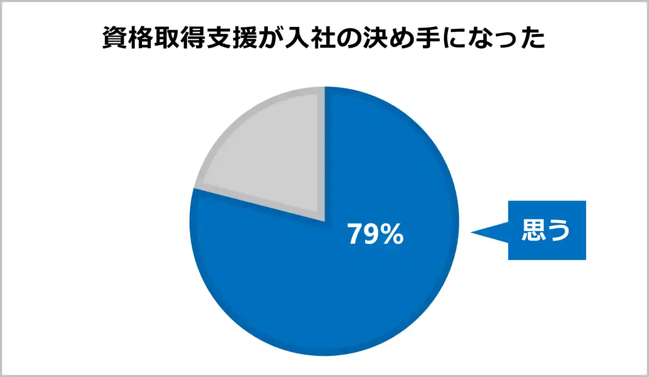 3.内定者の82.5%が「資格取得支援制度」を入社の重要な決め手に 2025年入社予定の内定者を対象に、「入社後の一級建築士取得集中研修の実施は、当社への入社を決める際の要因の一つとなったか」というアンケートを実施したところ、「思う」と回答した人が約79%にのぼりました。この結果から、資格取得支援制度の魅力が若手人財の入社意欲を高め、採用活動においても、企業の選ばれる理由になっていることが明らかになりました。 |