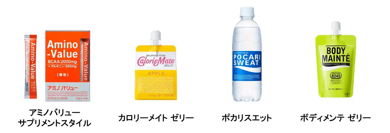 | 当大会では、エビデンスに基づき開発したニュートラシューティカルズ関連事業の各種製品を提供します。人間の体液(身体の水分)には、水分だけでなくナトリウムなどの電解質が含まれています。体液に近い組成を持つポカリスエットを、レース直前、コース上の給水所、レース直後に提供し、ランナーの効率的な水分・電解質補給をサポートします。当日はポカリスエットに加え、レース直前には持久系アミノ酸BCAAを手軽に摂れる「アミノバリュー サプリメントスタイル」および5大栄養素を手軽に摂れる「カロリーメイト ゼリー」、レース直後には体調管理とリカバリーサポートに役立つ「ボディメンテ ゼリー」を提供することで、目標達成に向けて取り組むランナーのコンディショニングをサポートします。また、約11,000人のボランティアに向けて「カロリーメイト ゼリー」を提供し、長時間にわたり大会を支える方々の体調管理にも貢献します。 | |||||||||