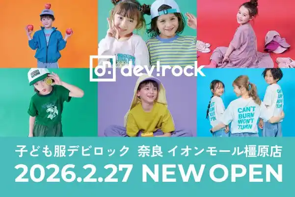 | グロウ株式会社(本社:大阪市北区)は、EC発子ども服ブランド「devirock (デビロック)」の全国2店舗目となる実店舗を2026年2月27日(金)イオンモール橿原にオープンします。 | ||||||||